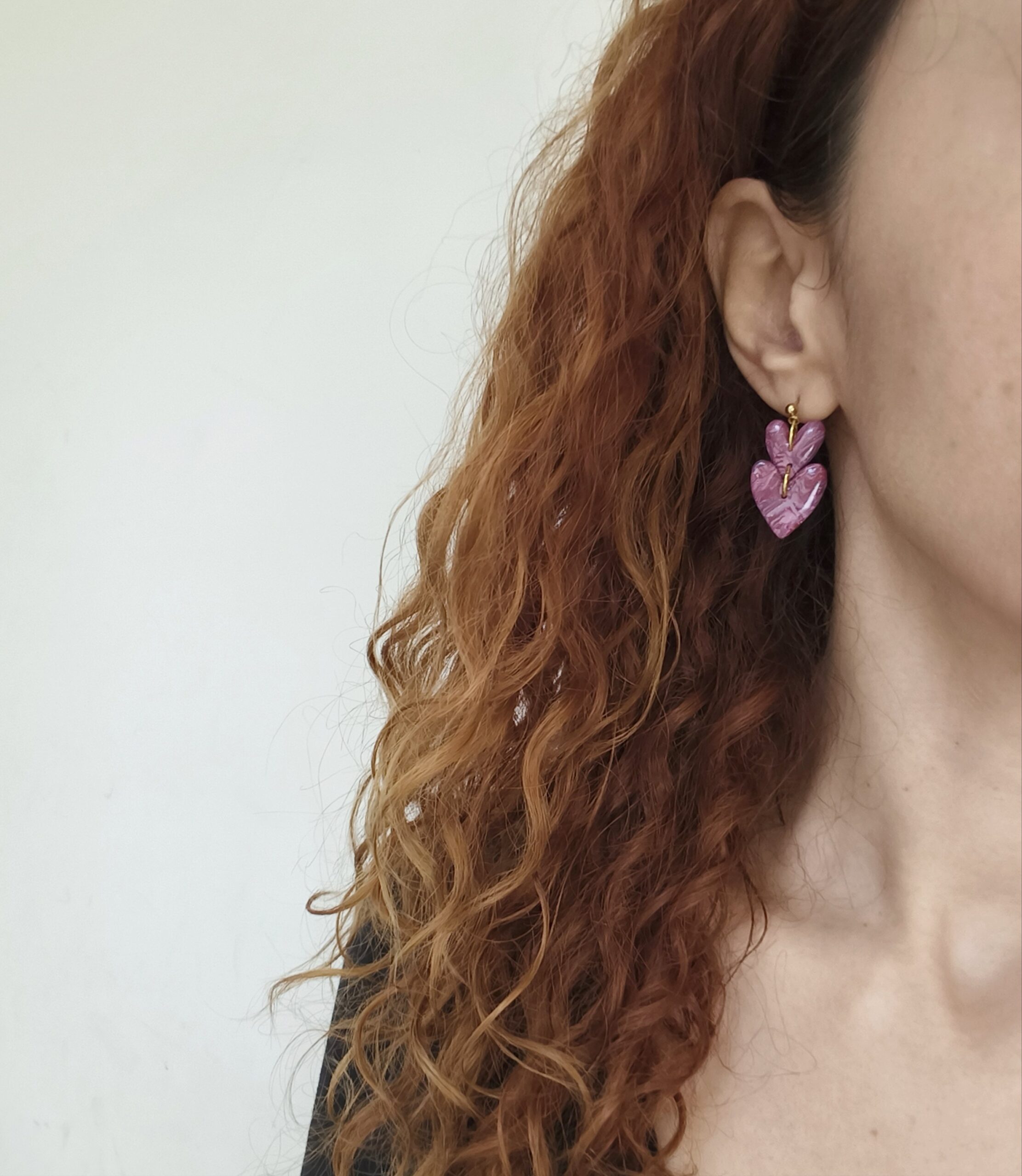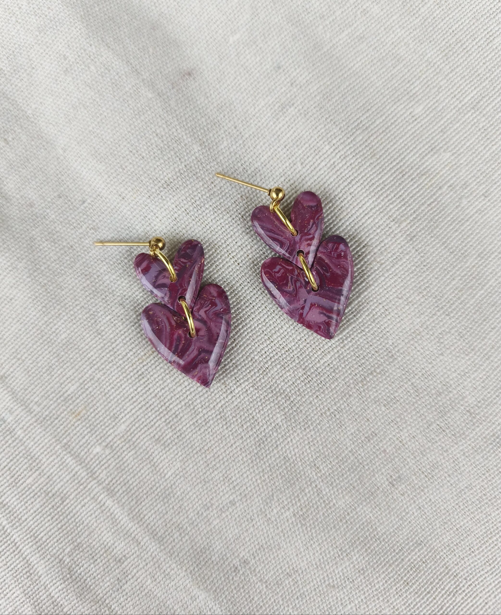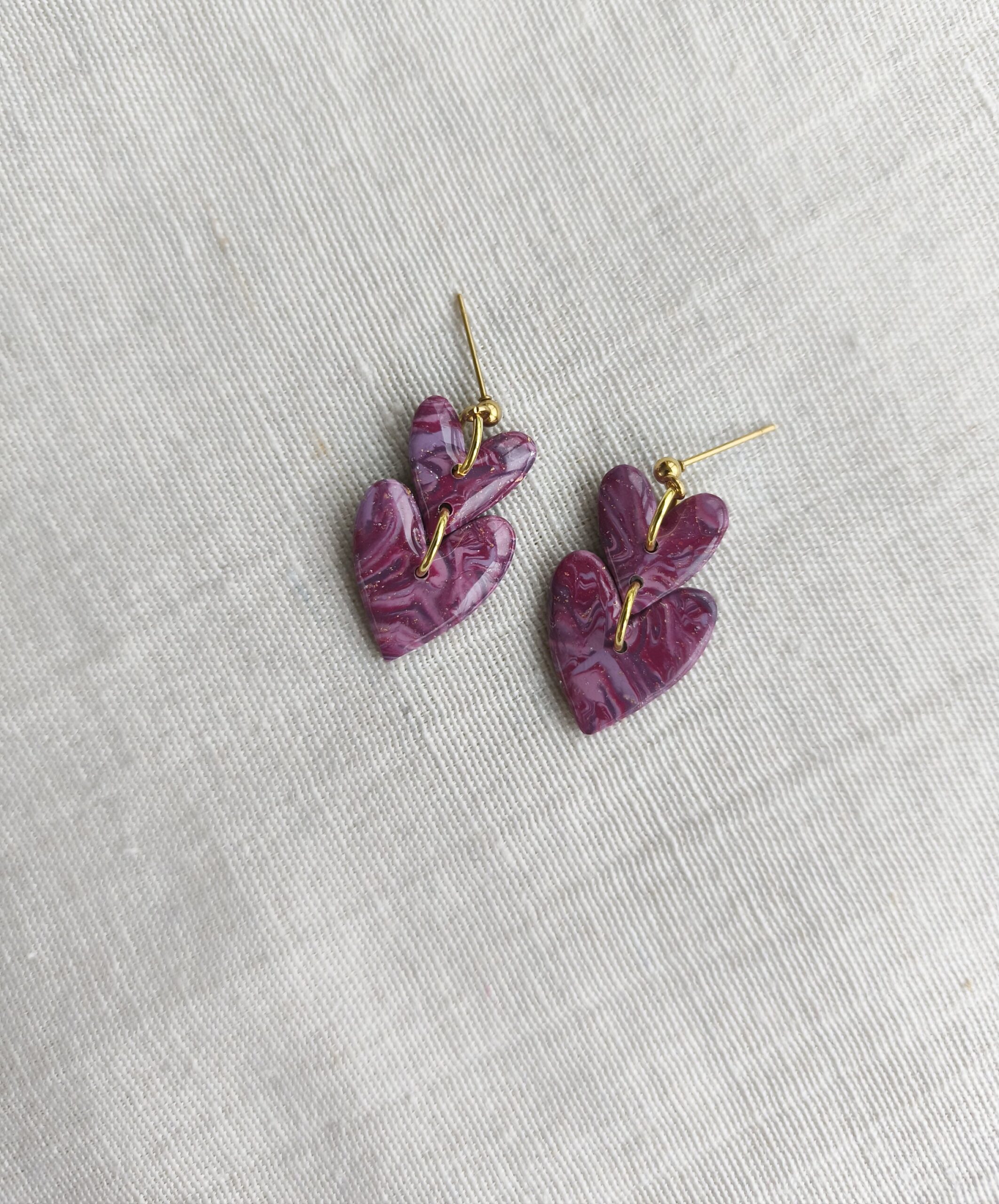Unique handmade heart earrings in marbled berry magenta with a glossy touch. Ideal for adding a touch of playfulness and cuteness to your everyday outfits.