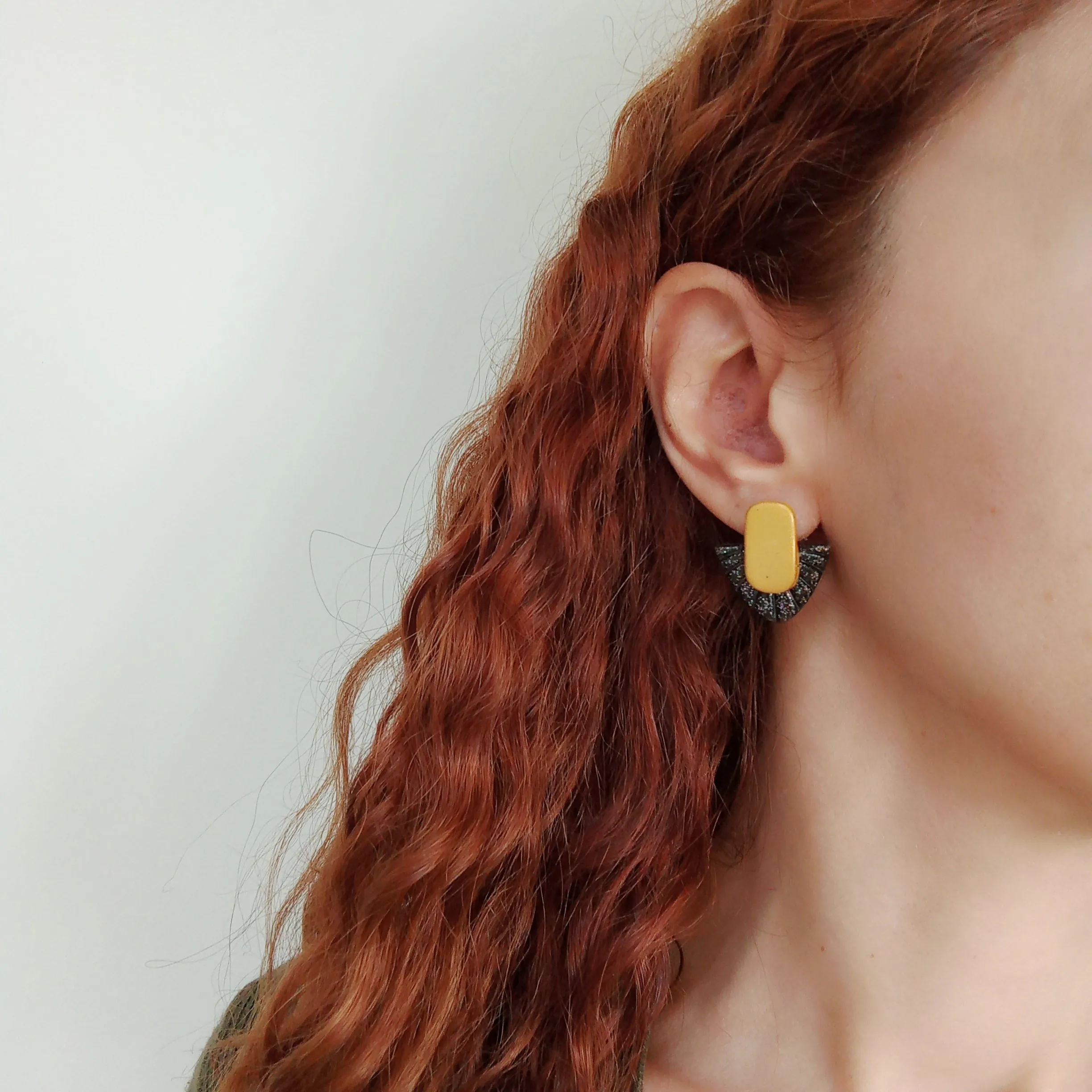 Materials: polymer clay, glitter, gloss varnish, stainless steel earring studs.