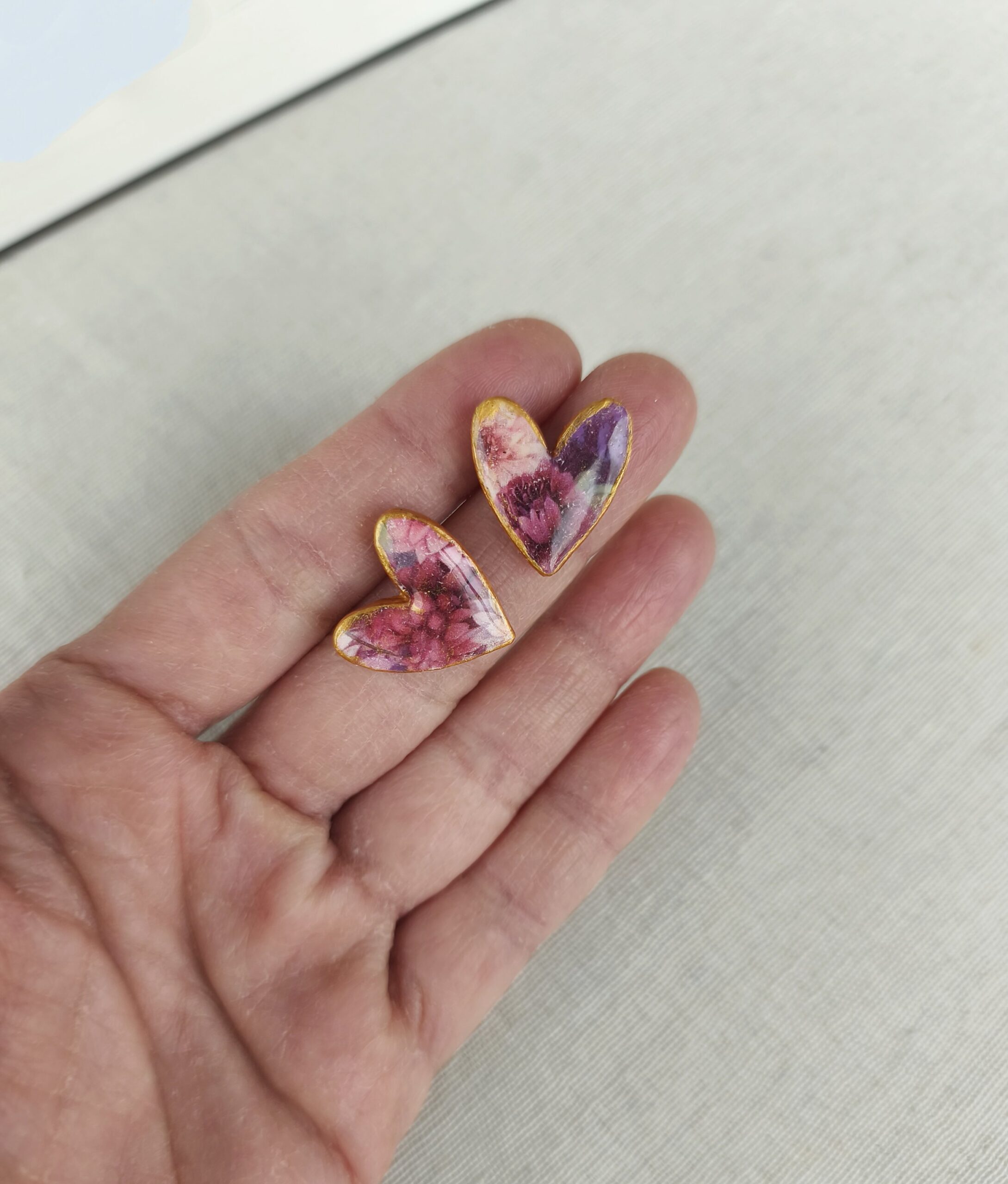 Materials: polymer clay, varnish, UV resin, stainless steel earring posts.