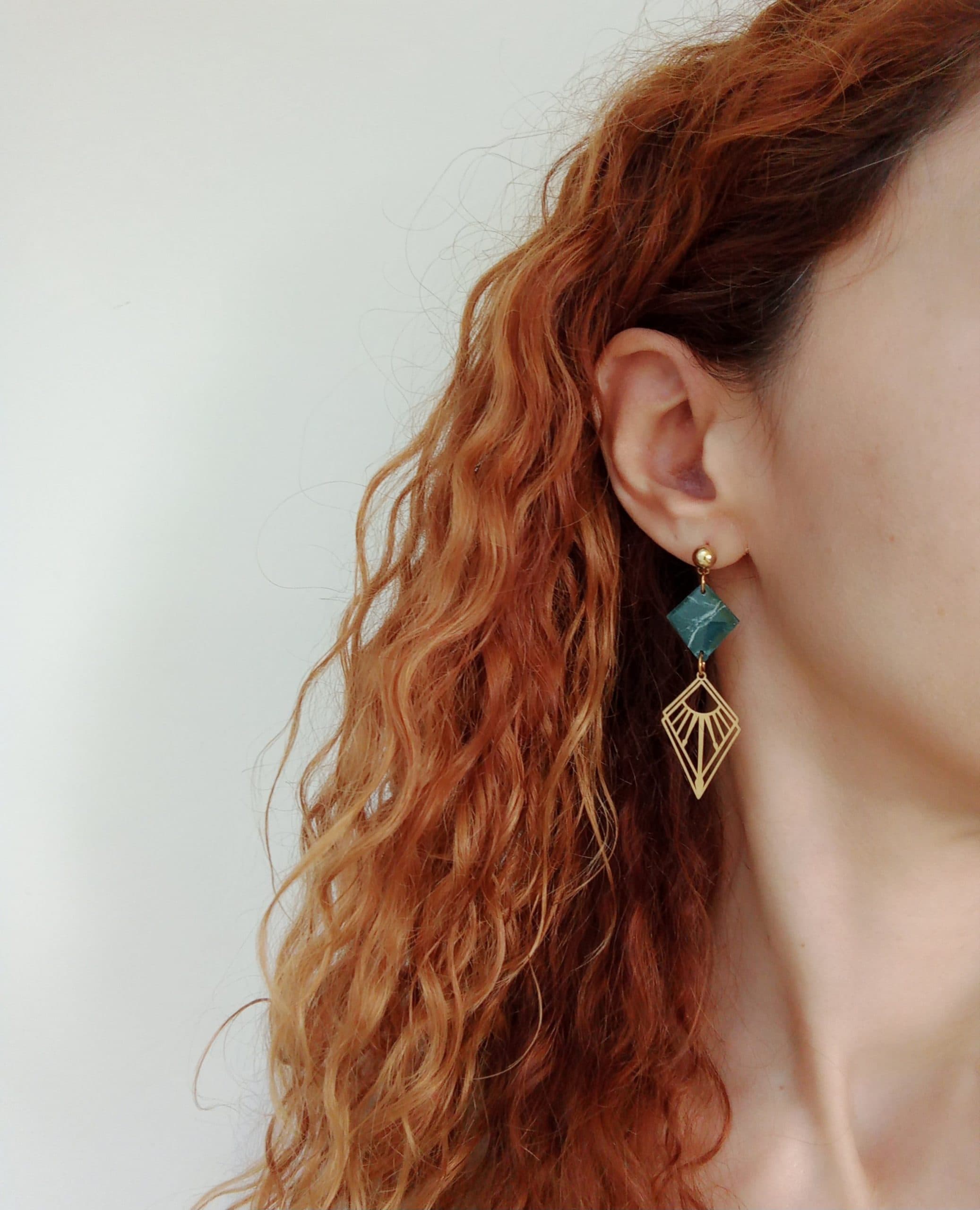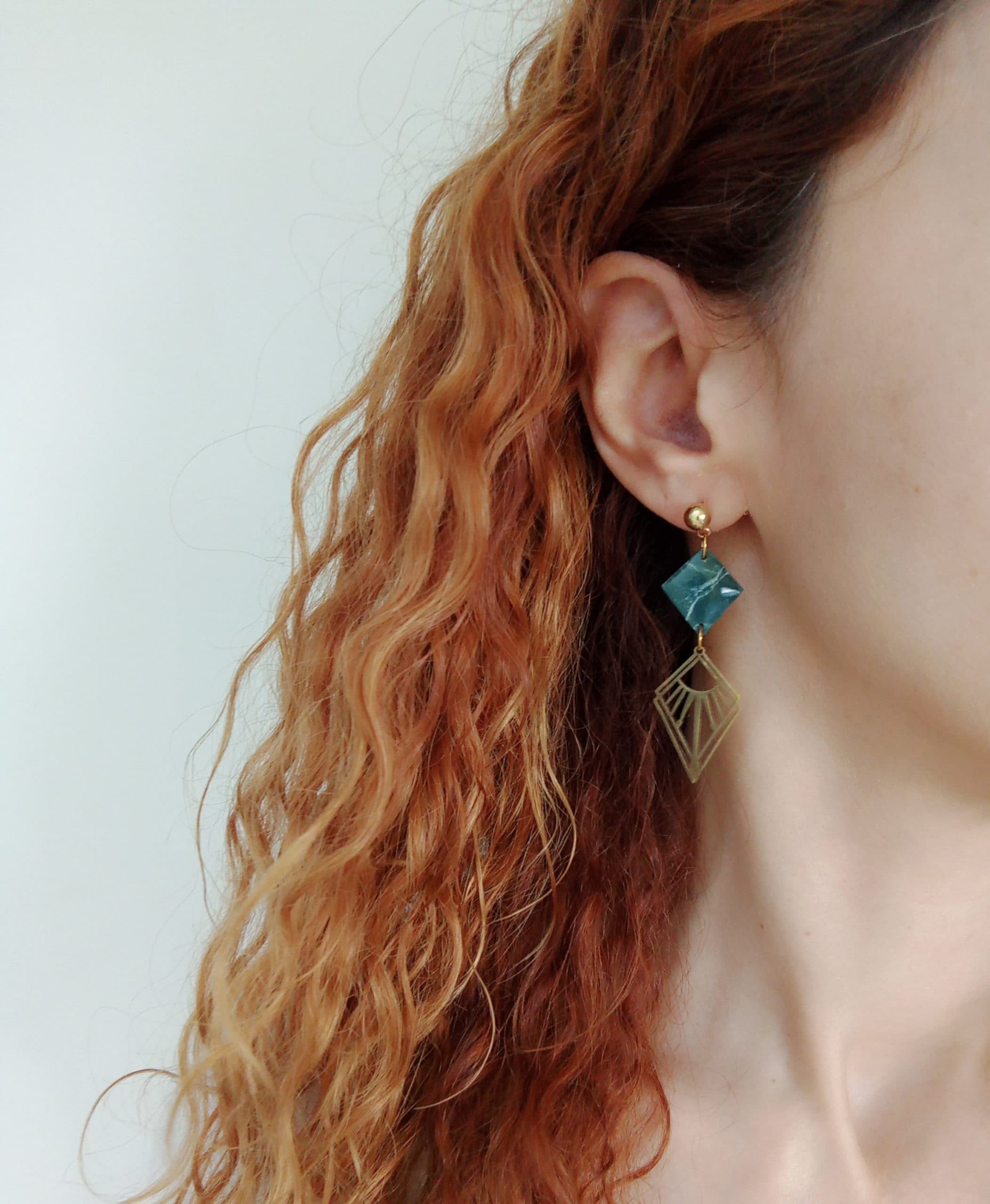 Marbled dark green rhombus earrings