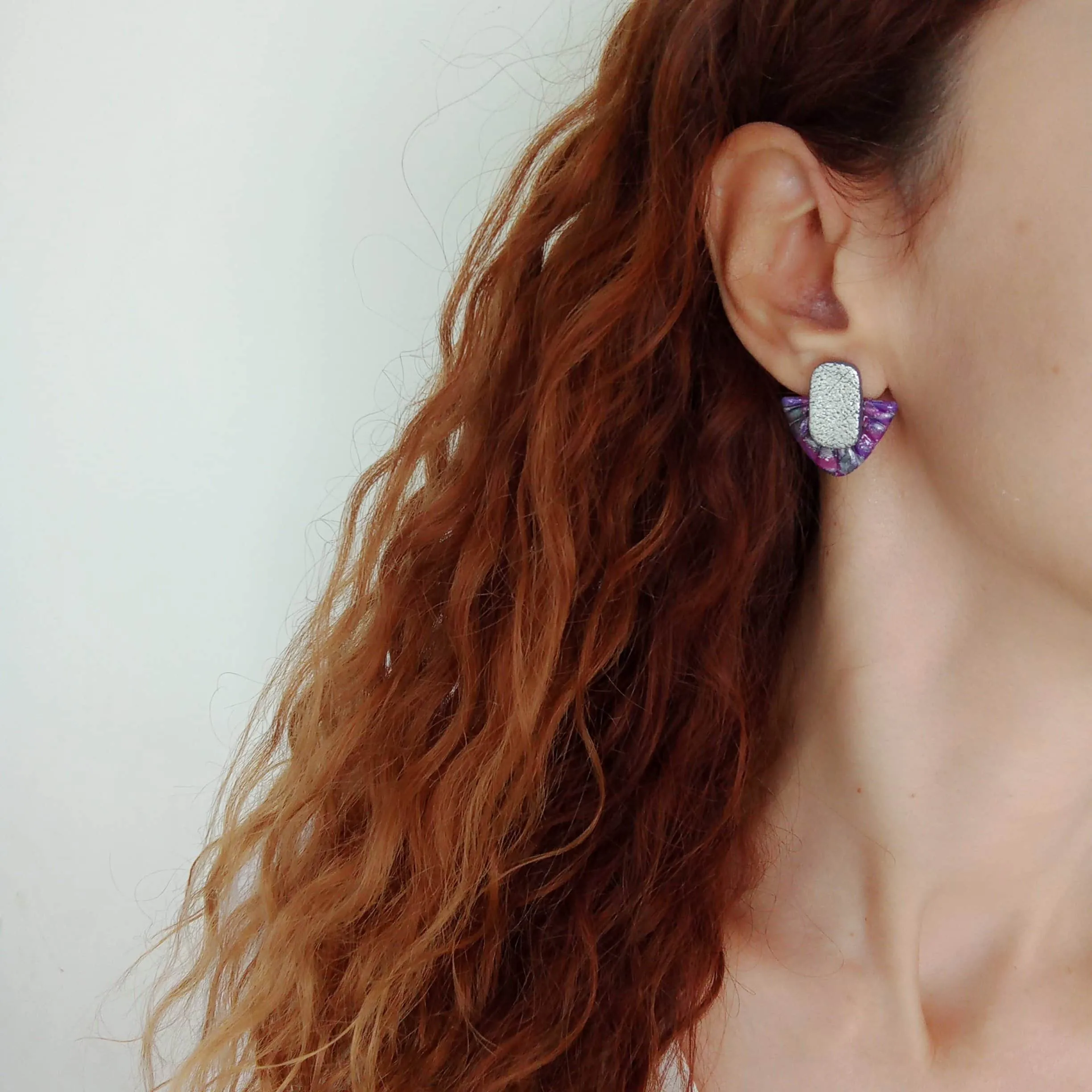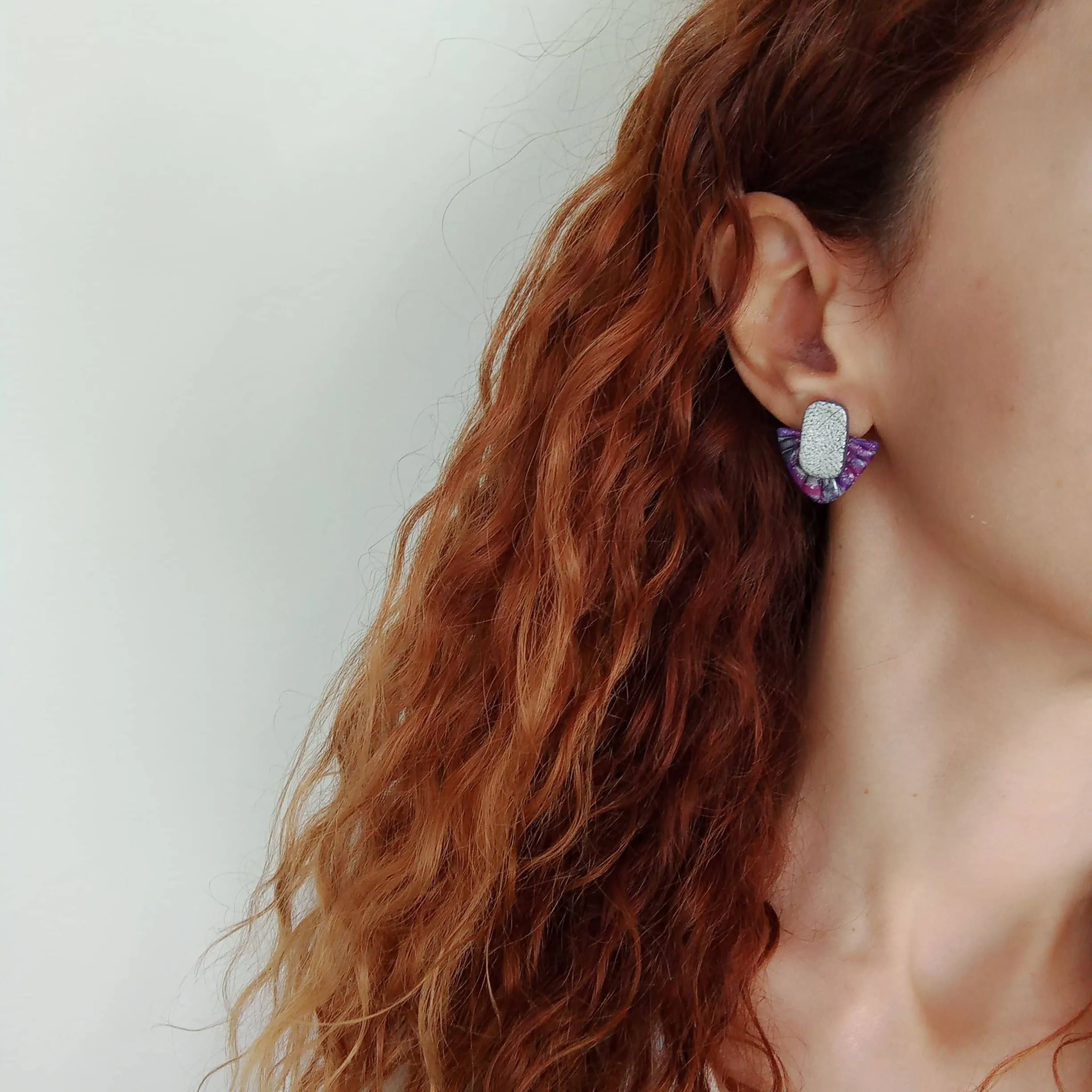 Materials: polymer clay, imitation silver leaf, gloss varnish, stainless steel earring posts.