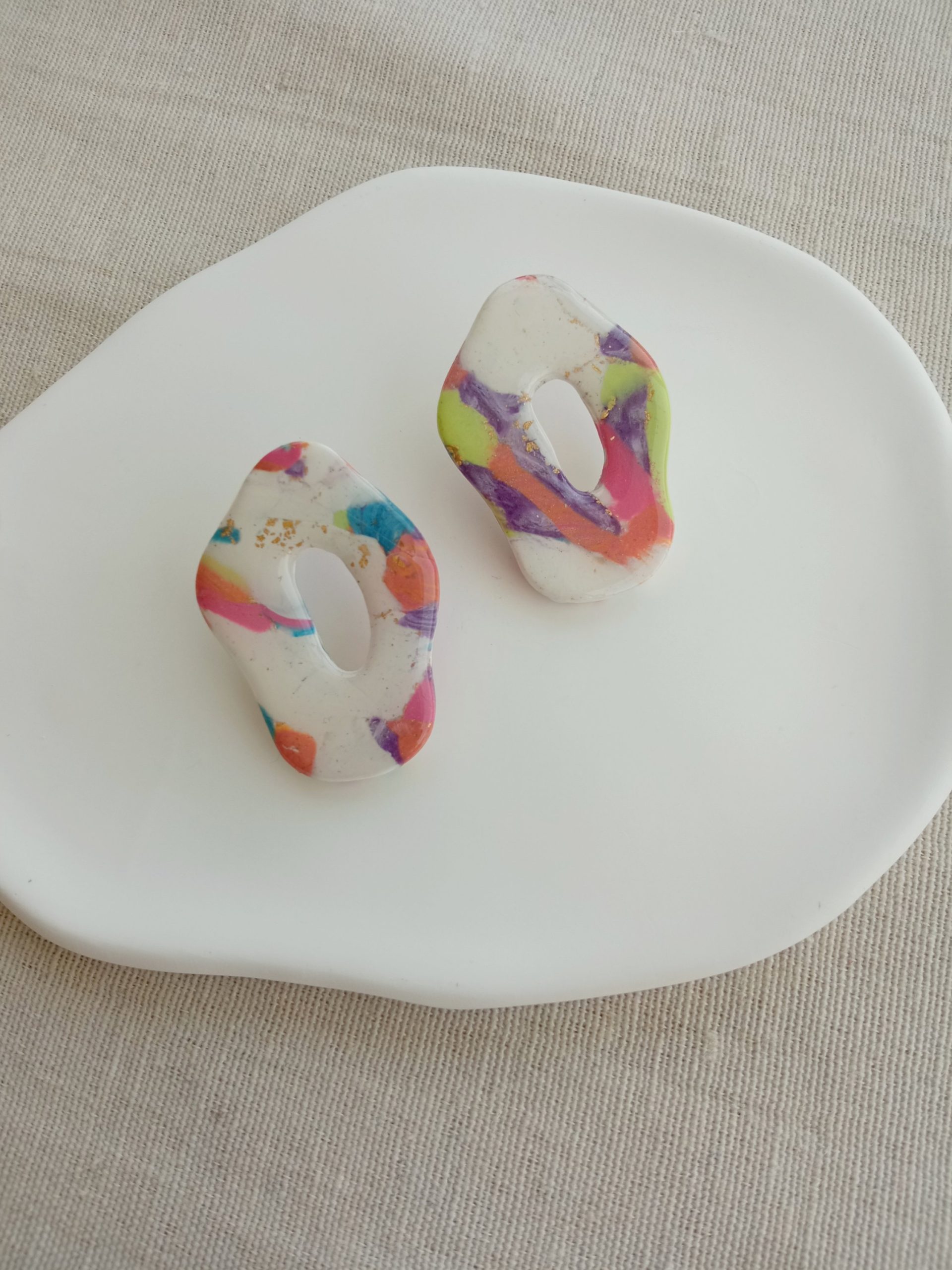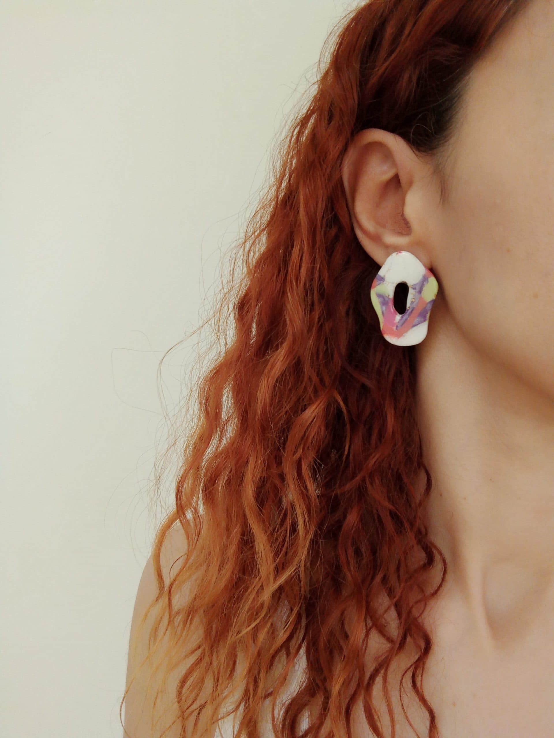 Materials: polymer clay, UV resin, imitation gold leaf, stainless steel earring posts.