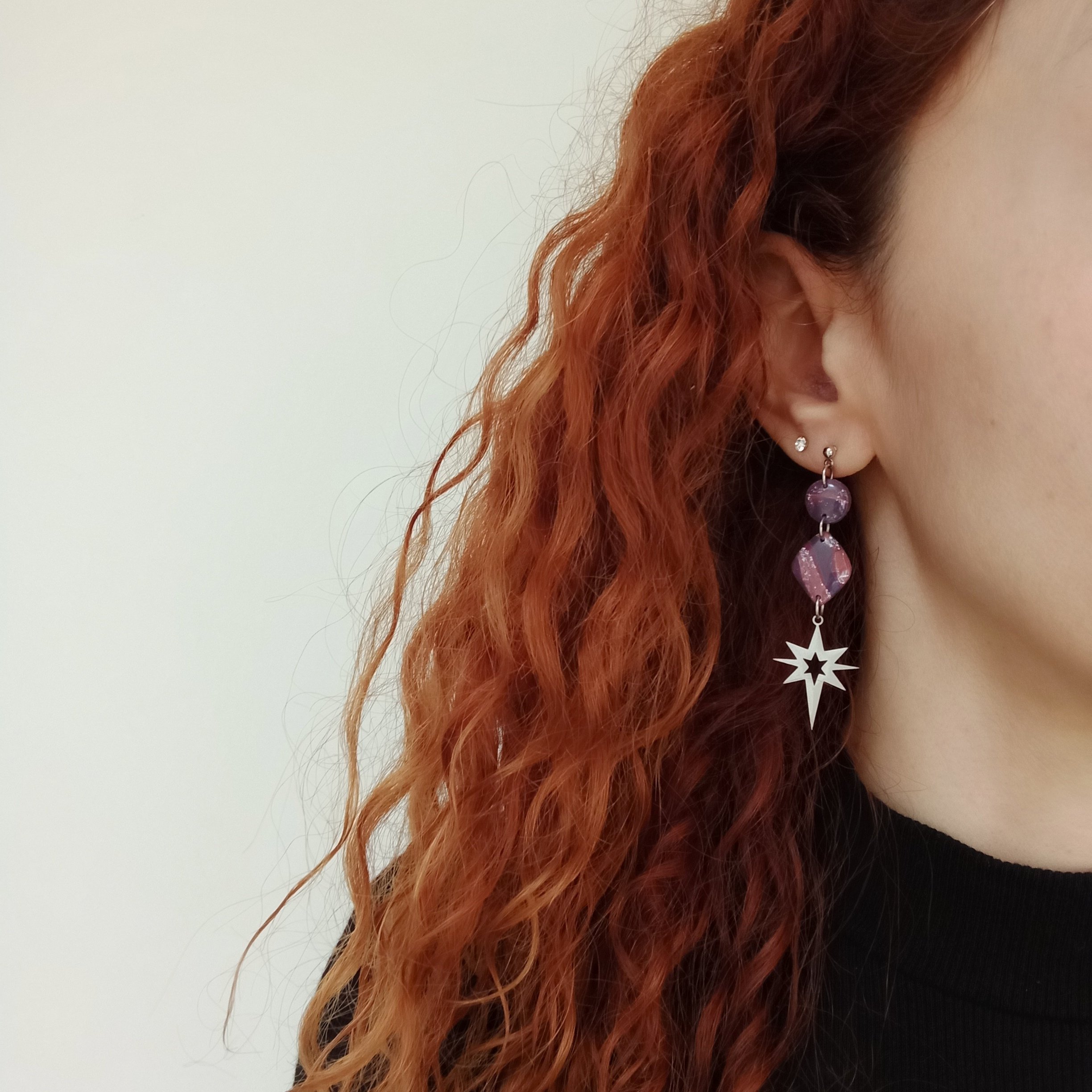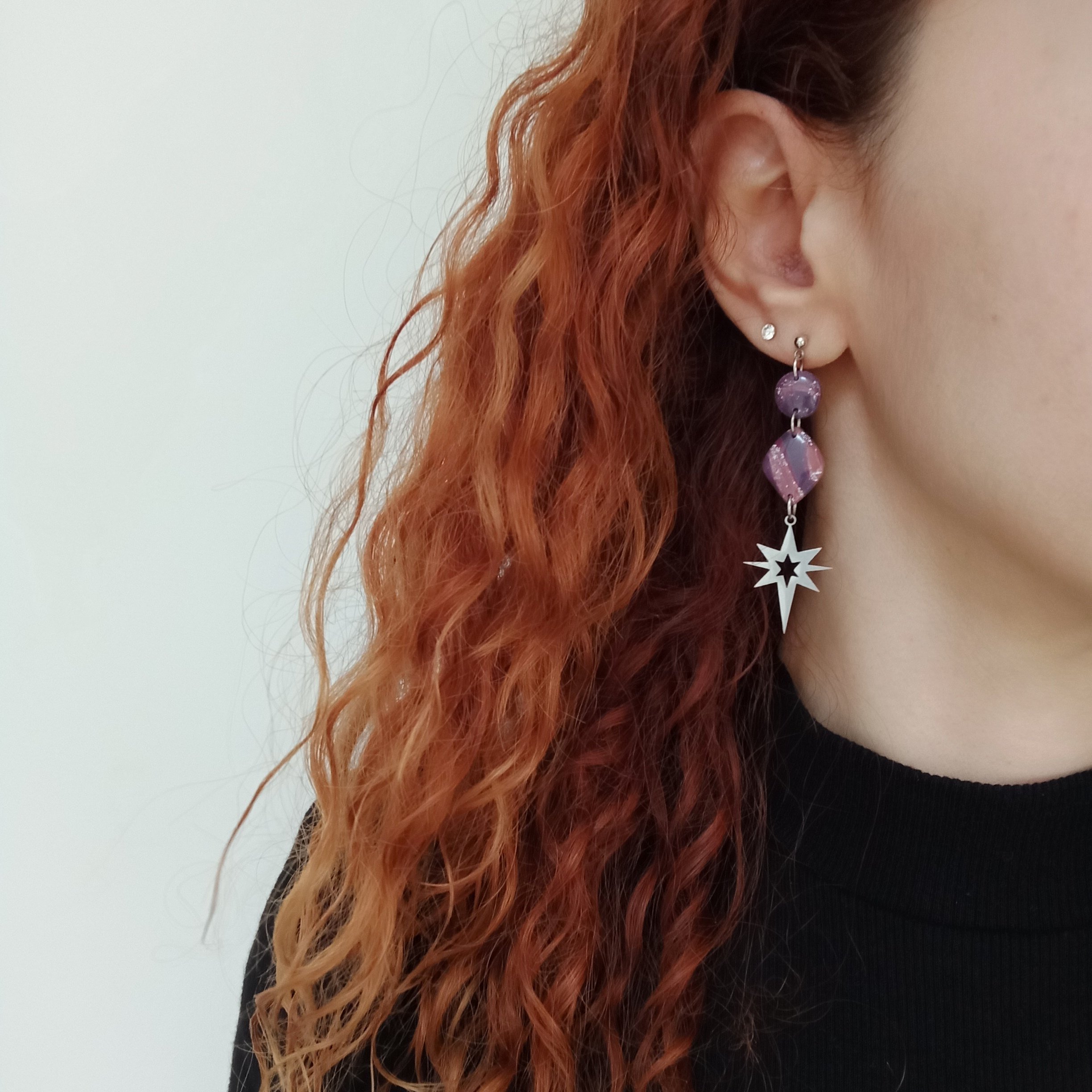 Materials: polymer clay, resin coating, imitation silver leaf, stainless steel earring studs.