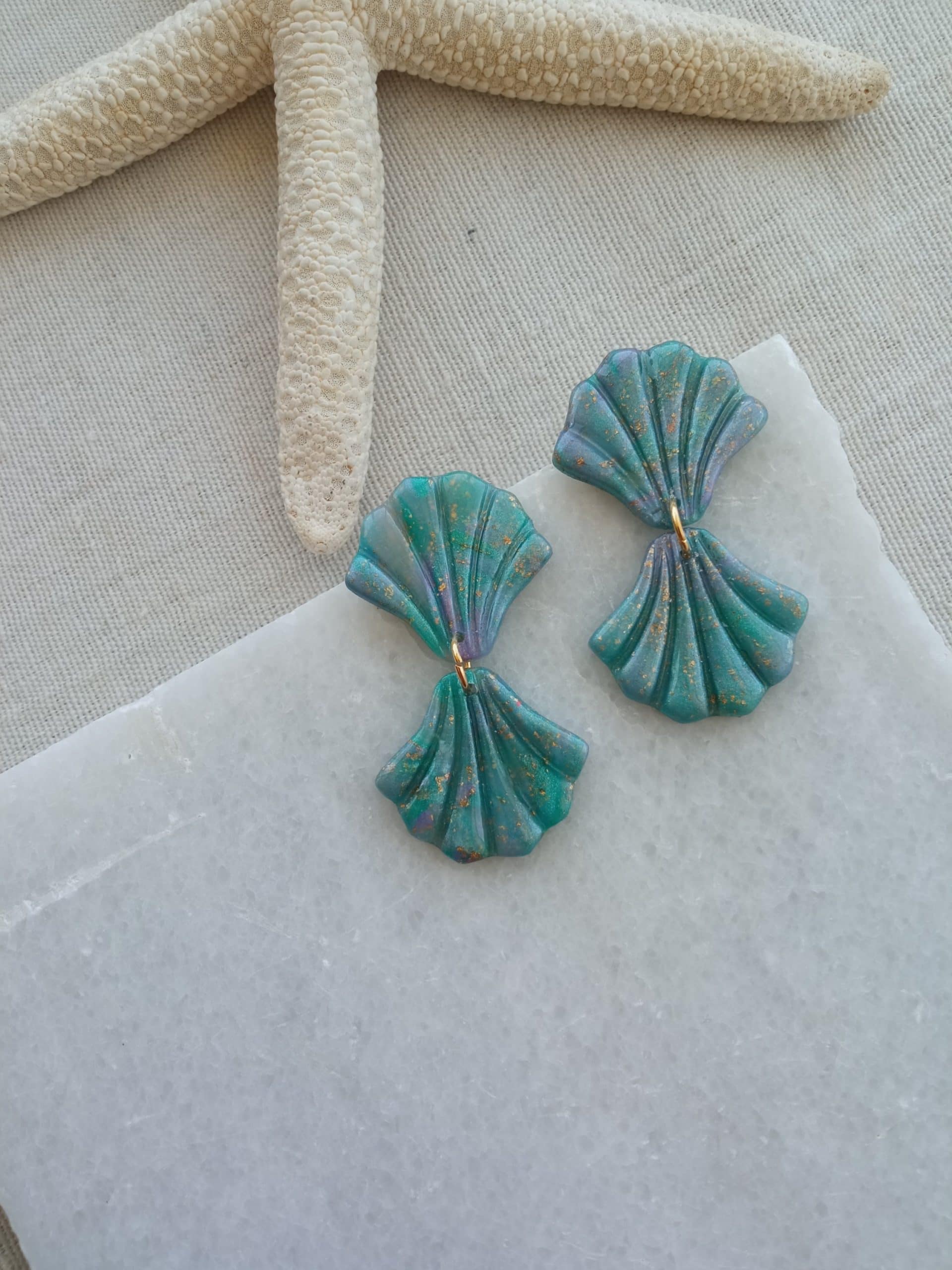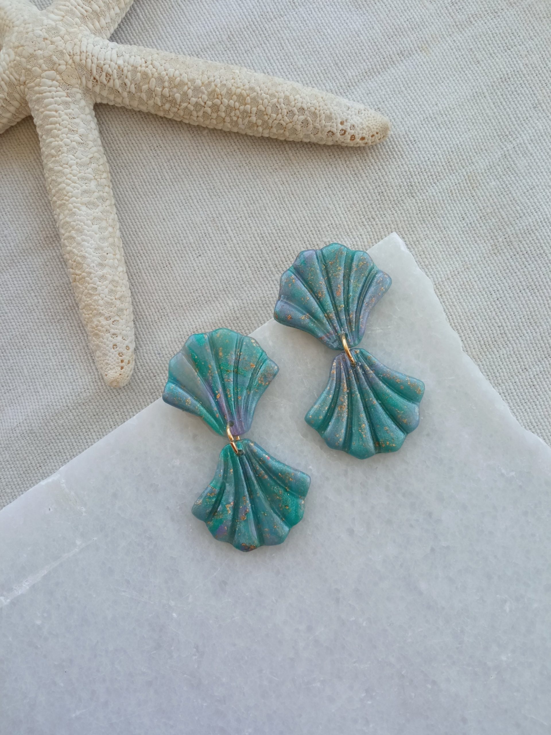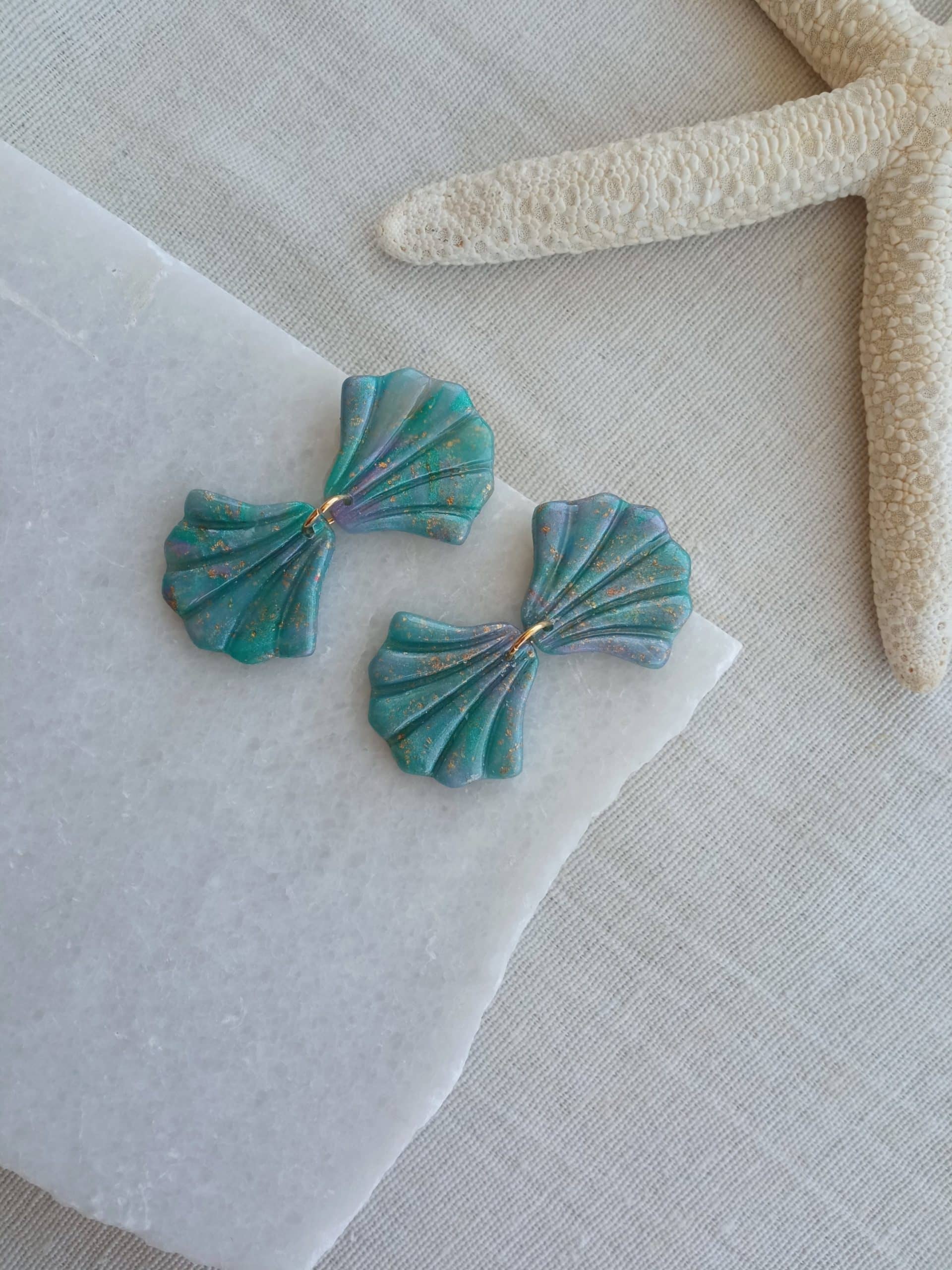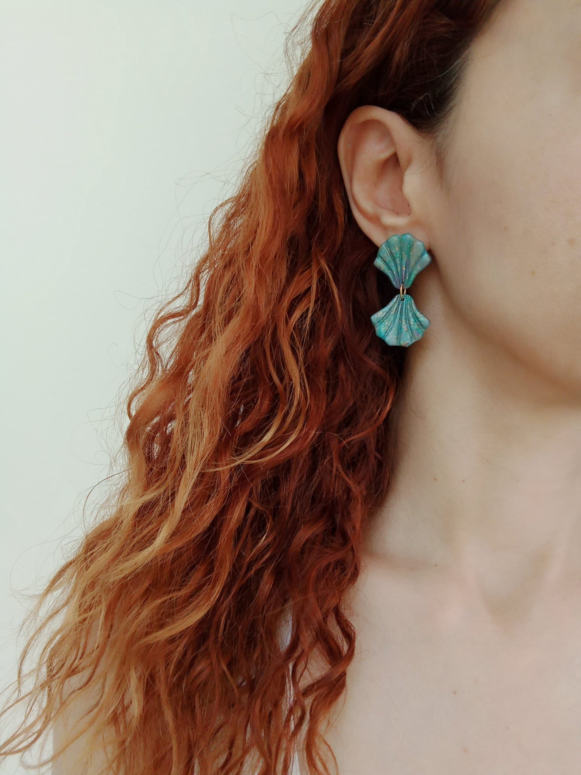 Materials: polymer clay, imitation gold leaf, UV resin, stainless steel earring posts.
