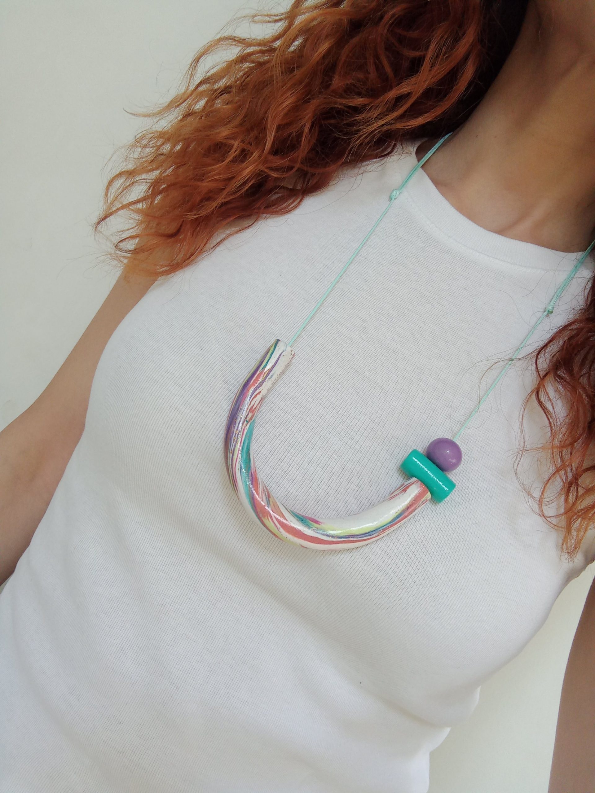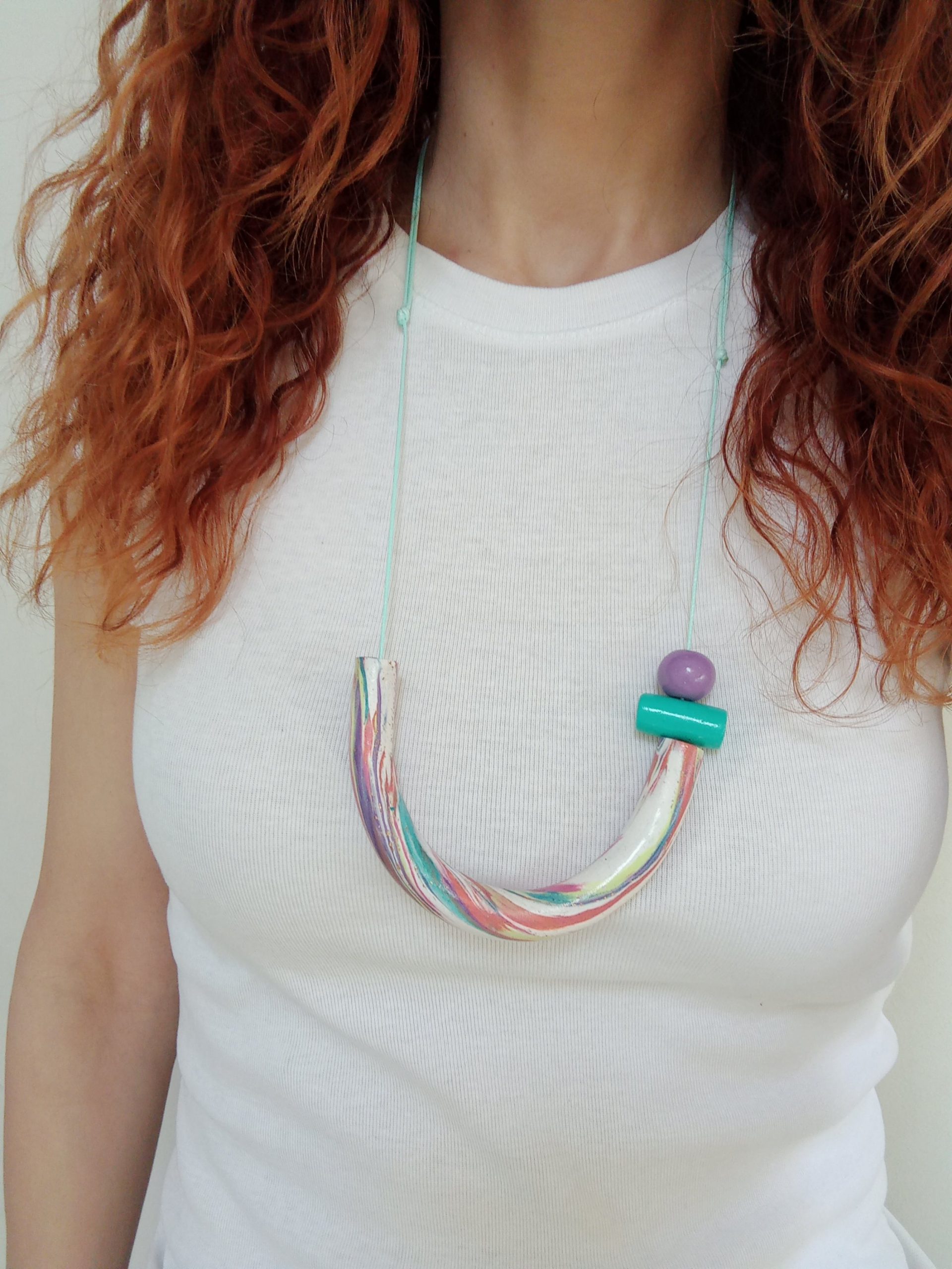 Materials: polymer clay, varnish, waxed polyester cord (adjustable length).