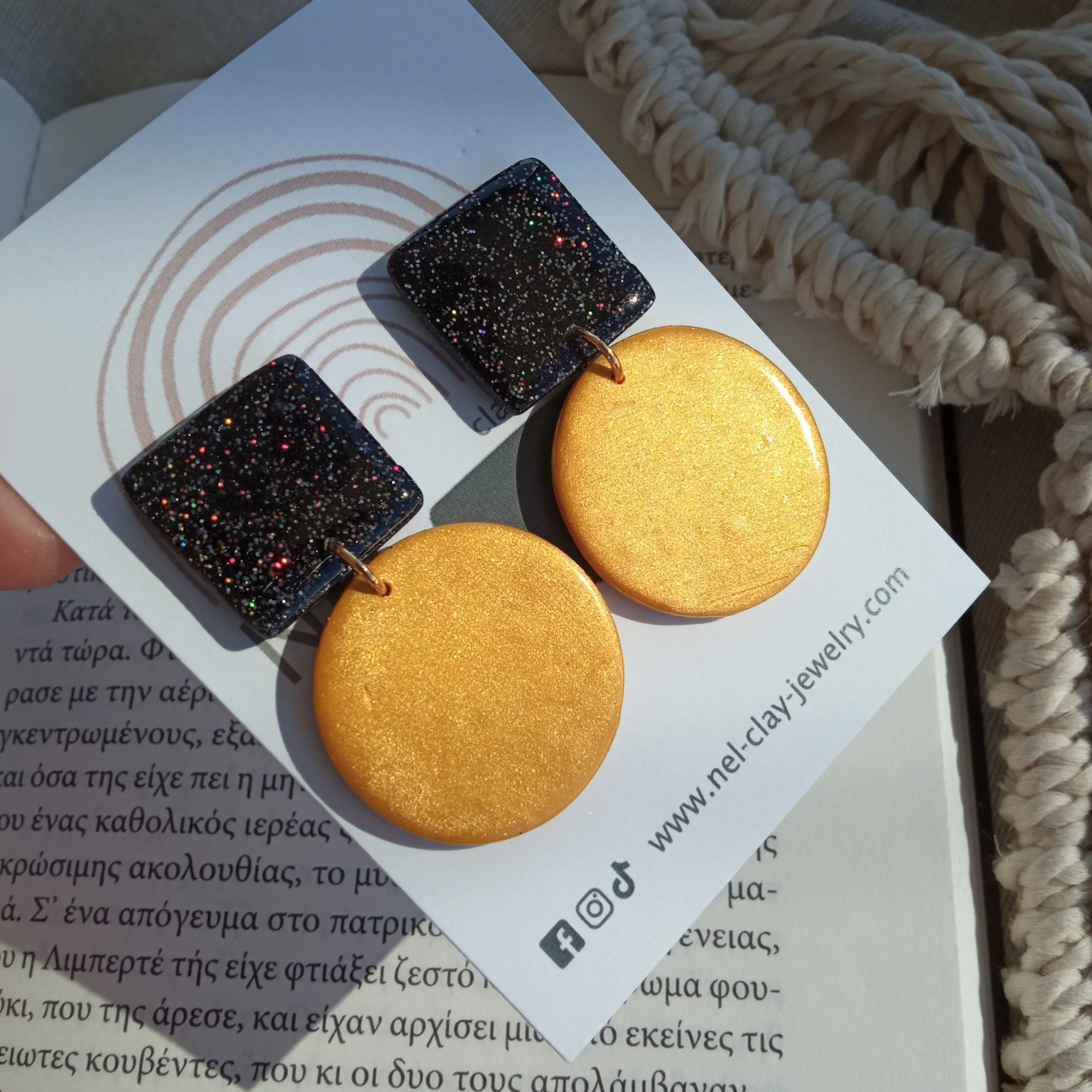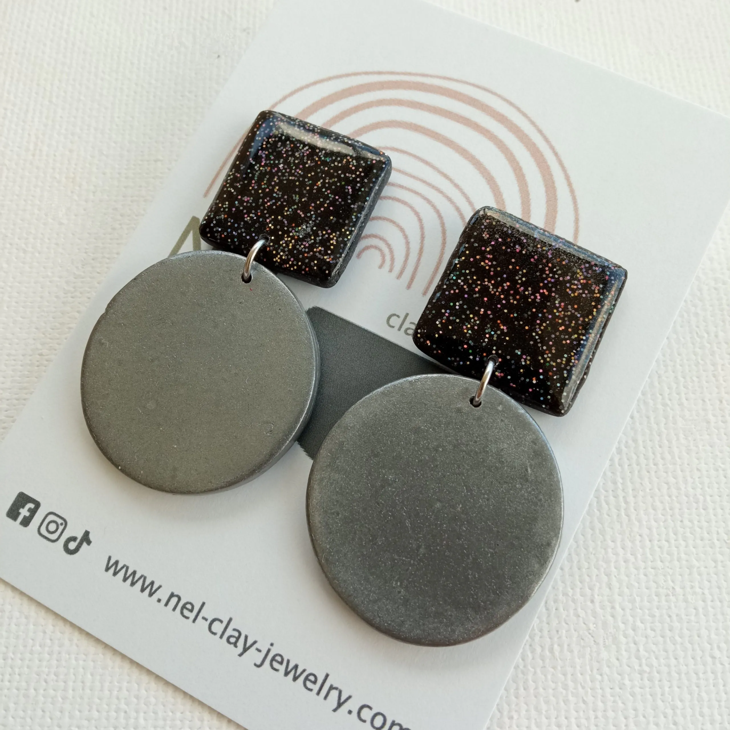 Materials: polymer clay, glitter, gloss varnish, stainless steel earring posts.